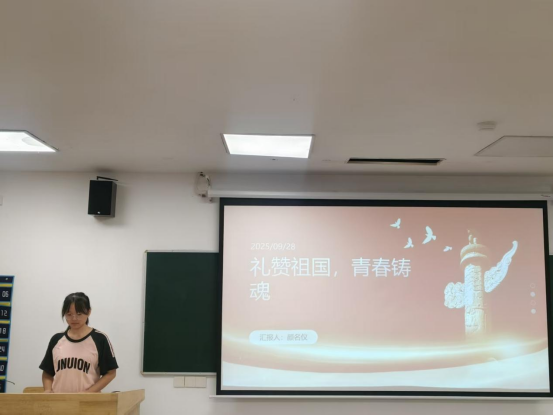 活动以一段激昂的爱国主义视频拉开序幕,历史的厚重与时代的奋进在画面中交织,瞬间点燃全场氛围。紧接着,颜名仪同学以“礼赞祖国,青春铸魂”为主题开启宣讲。