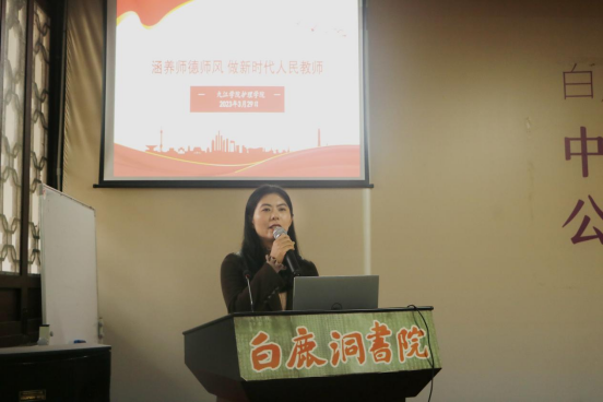 在紫阳书院的文会堂,学院党委书记郭青还带领大家重温了《习近平总书记在同北京师范大学师生代表座谈时的讲话:做党和人民满意的好老师》原文,并由蔡端颖院长主讲了一堂以“涵养师德师风 做新时代人民教师”为主题的微党课,从正己修身、自省初心以及师院合力三个方面与大家分享了如何提升我们教师的职业道德素养,加强教师队伍师德师风建设。