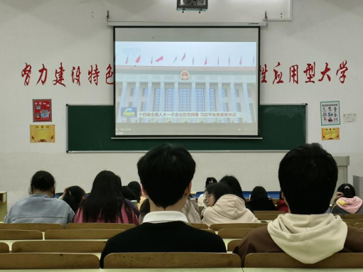 观影前,全体成员一同观看了十四届全国人大一次会议在京闭幕视频,学习习近平总书记重要讲话精神。学生代表们积极发言,表达青年大学生学习两会精神,传承红色血脉的重要性和必要性。