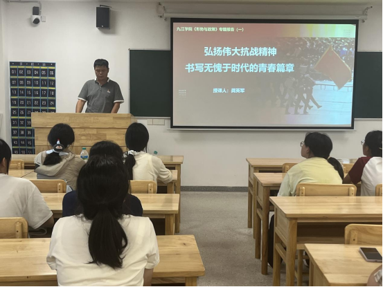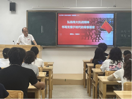 在研究生楼131教室,张友木以“弘扬伟大抗战精神,书写无愧于时代的青春篇章”为主题,为护理A2515班同学上了一堂精彩生动的开学第一课。他从中国人民抗日战争的历史进程、中国共产党在抗日战争中发挥了中流砥柱作用、中国人民抗日战争的历史意义以及抗战精神的历史启示和时代价值四个方面展开讲授,重点围绕抗战精神的历史启示和时代价值,和同学们进行深入交流。