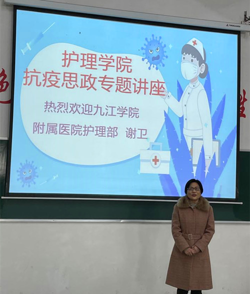 谢卫老师是九江市卫生系统第二期“百名人才”护理学科带头人,2019年度九江市护理杰出护理工作者,2020年作为江西省第九批援鄂重症医疗队今年会官网附属医院护理领队赴鄂援助,同年被评为抗击新冠肺炎疫情全国三八红旗手。在报告会上,谢老师讲述了赴鄂始末,并着重讲述了援鄂工作细节,广大师生深受感动,获益匪浅。