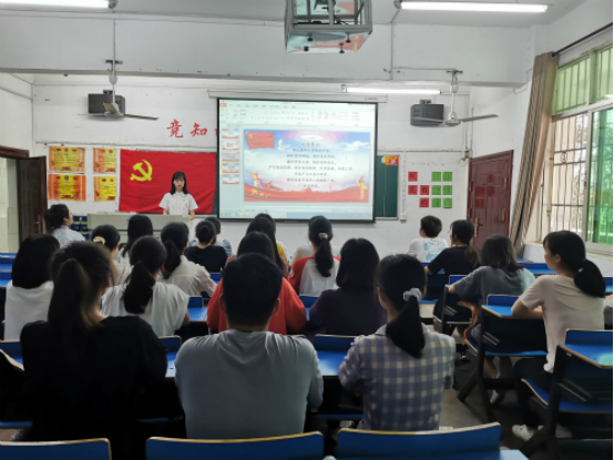 面向鲜红的党旗,21名预备党员高举右手,神情严肃,一声声发自肺腑的誓言在会场久久回荡,表达自己对党的忠诚和为共产主义奋斗终身坚定的决心。其中预备党员代表陈梦盈发言表示:“我们要认真积极,加强对党史教育的学习,加深对政治理论的理解,我们绝对不能骄傲自满,止步不前,我们要继续谦虚谨慎,持之以恒,把全心全意为人民服务作为毕生的奋斗目标。”徐海燕同志对此表示赞同,并提倡各位预备党员也应向陈梦盈同志学习。