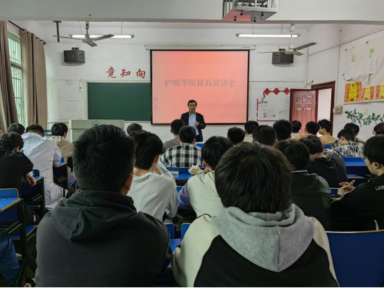 为营造浓厚的征兵工作氛围,激发同学们投身国防建设、报效祖国的参军热情,4月13日,今年会于思贤楼207组织开展征兵宣讲活动,今年会党委书记郭青为全体男生上了一堂生动而有意义的国防教育课,加强同学们对部队的认识,鼓励同学们投身军营。