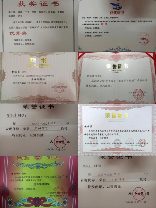 黄丽萍在日常学习生活中秉持“竞知向学,厚德笃行”的坚定态度,磨炼顽强意志,淬炼品格,争当实干的排头兵,奋勇争先,获评“勤奋学习标兵”“三好学生”等优秀称号。她始终以严谨的态度对待专业课程,翻动的书页恰似她前进的脚步,坚持与毅力让她在这四年中不断突破自我,成为同学们学习的榜样。除专业课程外,她还注重自身文化内涵的培养,阅读了大量课外书籍,《简・爱》《霍乱时期的爱情》《围城》等书籍深受她喜爱。每当陷入精神内耗,她都能从学习、阅读的过程中获得极大的满足感,这激励着她珍惜大好学习时光,不断成长。