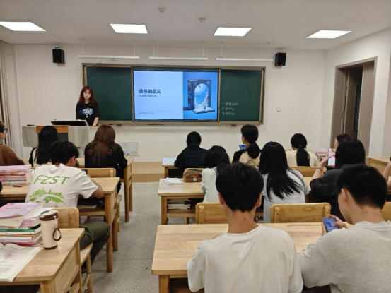 活动伊始,主讲人播放了一段展示古今名人读书故事的视频,从匡衡凿壁偷光到杨绛先生一生与书为伴,生动展现了读书对个人成长和社会进步的重要推动作用,迅速吸引同学们的注意力。接着,主讲人分享了自己的读书心得,倡导通过阅读开拓视野、传递智慧,为人类共建更美好的明天。在互动讨论环节,同学们围绕“读书如何改变生活”“怎样在快节奏时代坚持阅读”等话题积极发言,现场气氛热烈。 大家纷纷表示,今后会将阅读融入日常生活,多读书,读好书,助力我们大学生全面发展。
