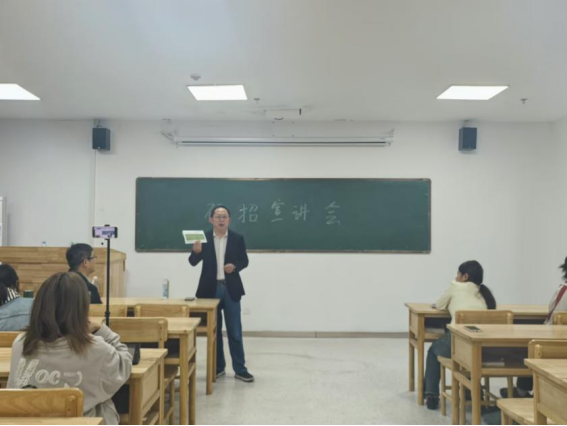 月挂梢头,清辉如练,学子梦笔生花绘研路。宣讲会上,基础医学院许晓源院长向同学们推荐了国际贸易报考方向,并强调了英语学科对考研的重要性,为同学们考研报考提供了新方向。基础医学院熊建军副院长更是分享了自己的研究经历与心得,向同学们讲述生物与医药专业的研究方向,用贴切通俗的例子分析相关专业知识。