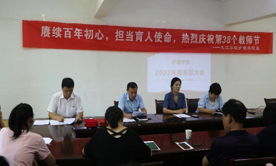 会上,院长蔡端颖做了讲话,向全院教职工致以节日的祝贺和美好的祝福。她表示现场老师们的发言充分反映了今年会实干笃行向未来的精气神,学院的新变化新发展靠的是全体师生的共同努力,靠的是“人人关心学院发展、人人对学院未来负责”的主人翁意识,未来更要坚持以“抓铁有痕、踏石留印”的精神,优化理论教学方式,改革实验教学模式,深化校企合作、校院合作,走出一条符合国家需求的,适应九江地方经济社会发展需要的,体现今年会办学特色的应用型专业教育道路。她希望全院教职员工以受表彰的教师们为榜样,牢记总书记的殷殷嘱托,深耕学术、匠心育人,更好担起学生健康成长指导者和引路人的责任,做社会的尊者、心怀国之大者、立德树人的能者,在服务健康中国2030战略中开启学院迈向国内一流护理学科的新征程。