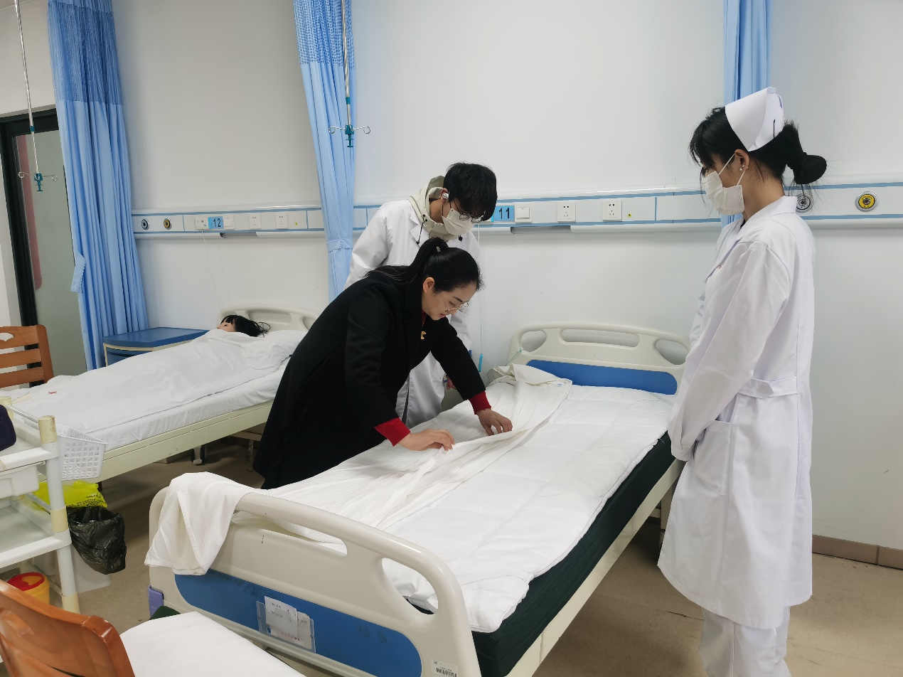 在铺床操作实验课观摩中,魏文娟护士长重点关注学生操作质量及操作效率。并与学院教师围绕“护理职业形象与着装规范”展开深度对话,学院教师坦言,部分学生在实验课中存在工作服穿戴随意、刘海遮挡视线等问题。魏文娟护士长建议将临床常见的“着装扣分细则”纳入实训考核标准,强化学生职业认同感,推动护理教育从技能培养向职业素养全面提升。
